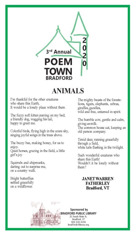 Bradford Poem Town 2020 Poem Town Daily! 4/12 ByGail Trede April 13, 2020April 13, 2020 Back to Poem Town 2020