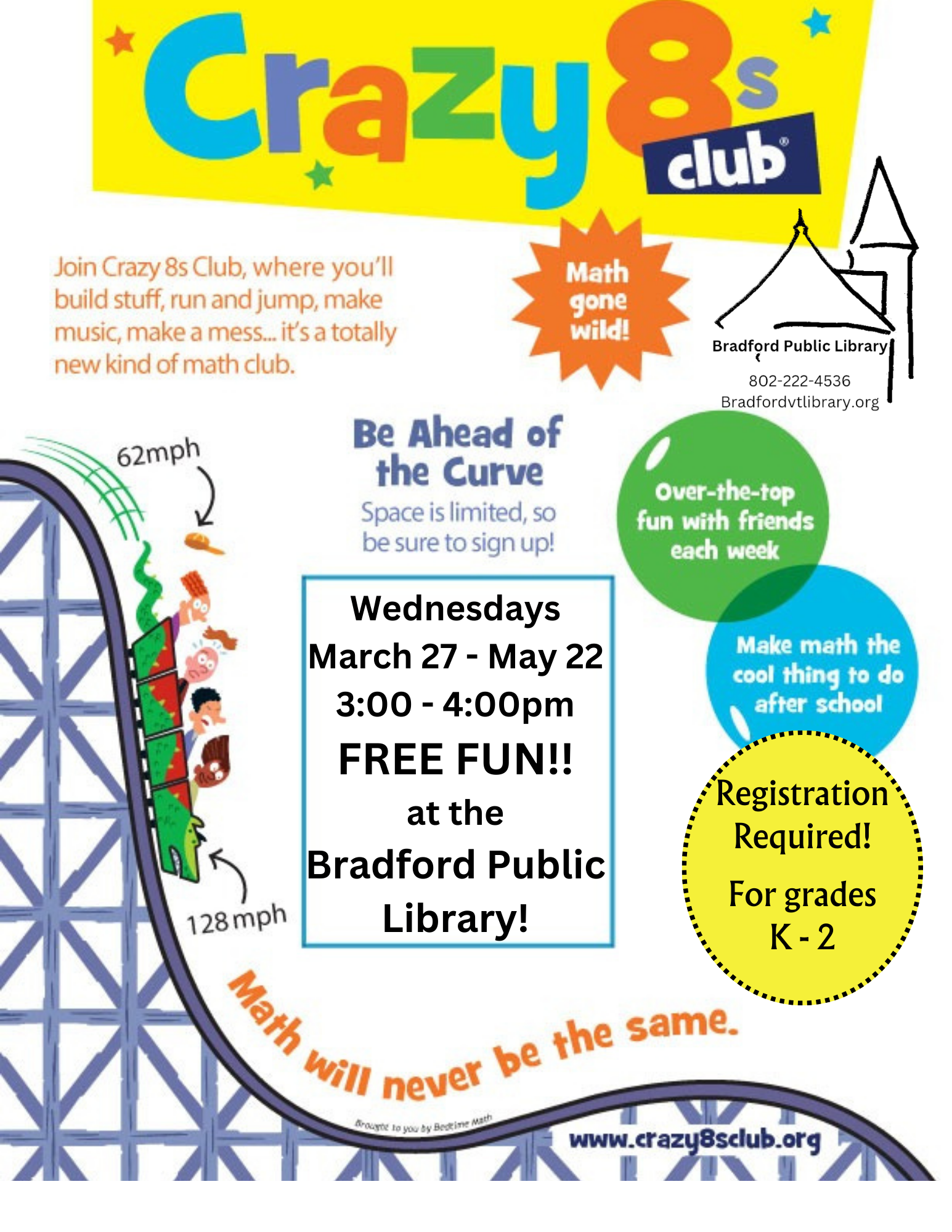 Home Page | Programs - Kids Corner | Uncategorized Crazy 8’s Math club for grades K-2! ByGail Trede March 22, 2024March 22, 2024