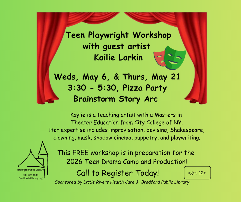 Register today at 802-222-4536 / gail@bradfordvtlibrary.org